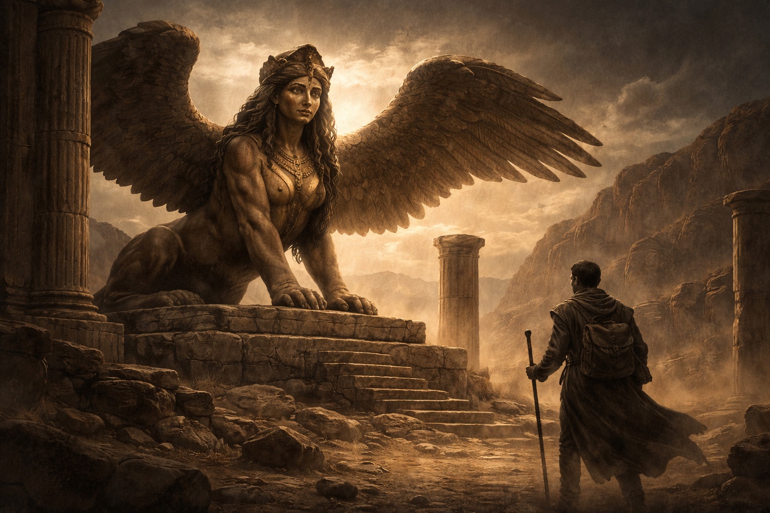 The Sphinx is intelligence turned predatory. It’s not about muscles, it’s about meaning. The danger is ignorance.